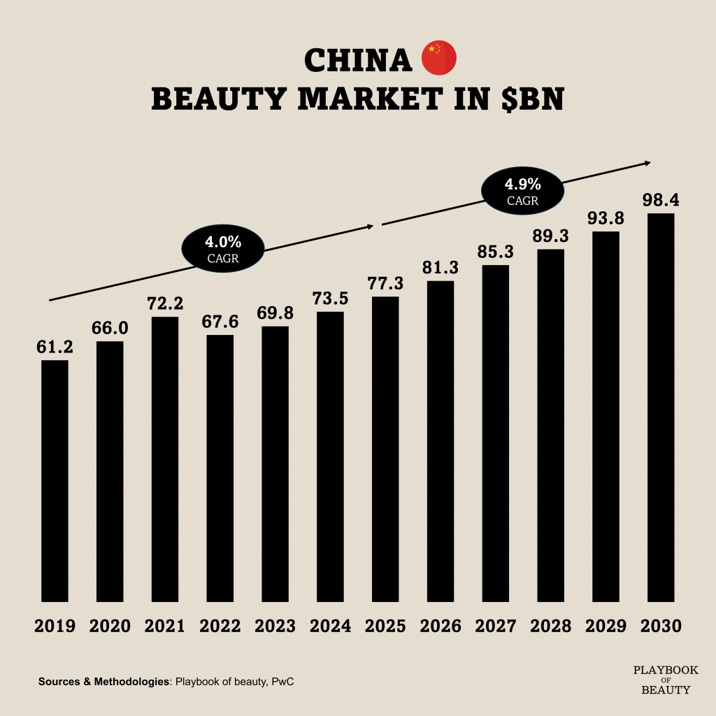 China’s beauty market, only second to the US at an estimated $77.3 billion in 2025 according to PwC, is undergoing a fundamental rebalancing. Its growth now trails the global average (4% CAGR 19-25), signaling not stagnation but a structural internal realignment. The long-standing dynamic where China was a net importer of prestige brands and an exporter of value goods is evolving.