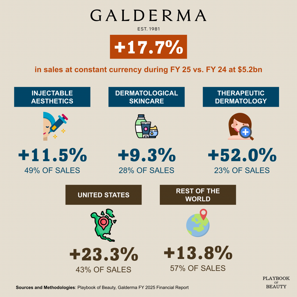 Galderma reported record full-year 2025 results, with net sales reaching $5.2bn, a 17.7% increase at constant currency. Growth was predominantly volume-driven, with a favorable product mix offsetting competitive pricing pressures. The company delivered double-digit expansion in both International markets and the US, while all three product categories outperformed their respective markets.