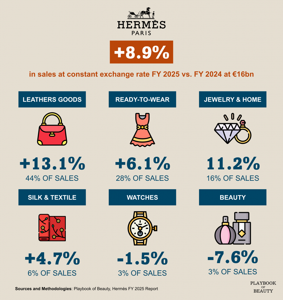 eather goods and saddlery, representing roughly half of group turnover, accelerated 13%. New silhouettes including So Médor and a reinterpreted Haut à Courroies à relier sustained demand as production capacity expanded. The 24th atelier opened in L’Isle-d’Espagnac and four further sites are scheduled through 2030.