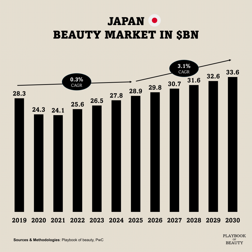 According to data from PwC, Japan’s cosmetics market, long the world’s third-largest, was overtaken by Brazil in 2023. Between 2019 and 2025, it stagnated posting a compound annual growth rate of 0.3% from 2019 to 2025 against a global growth rate of 5.3%. This is not a temporary slump but a reflection of deep-seated demographic and structural headwinds.