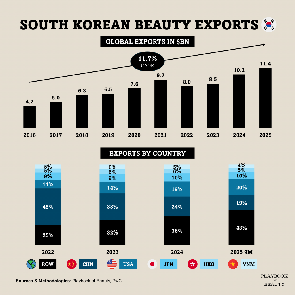 South Korean cosmetics exports surpassed the $11bn milestone in 2025, recording $11.4bn in total shipments. That represents a 12.3% increase year-on-year, with monthly exports hitting record highs throughout the year and September alone exceeding $1.15bn.
