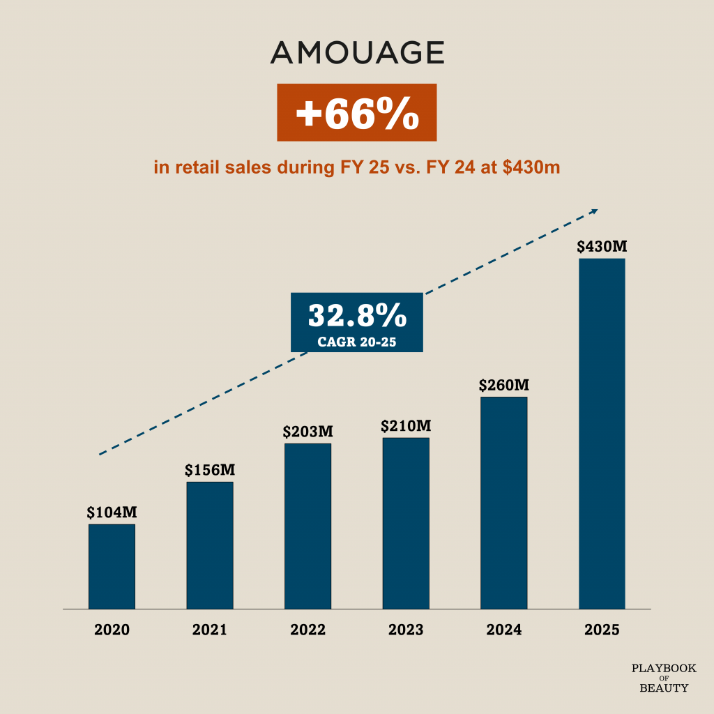 Omani luxury house Amouage closed 2025 with global retail sales of $430m, a 66% surge that marks the strongest result in its 42-year history.