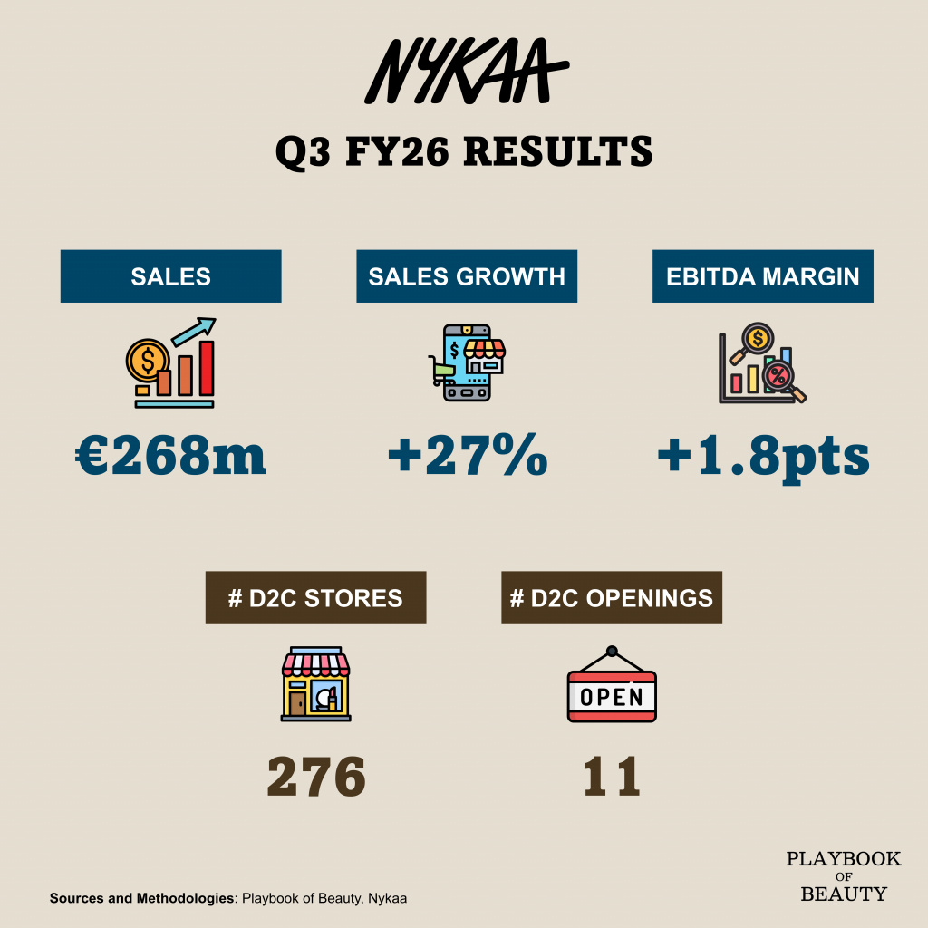 Nykaa, India’s leading beauty retailer, saw its consolidated net profit more than double to €5.9m in Q3 FY26, a significant increase from €2.4m in the same period last year. This performance was anchored by a 27% rise in overall revenue, which reached €268m. The core beauty and personal care segment, contributing the majority of revenue, also grew by 27% to €245m. EBITDA margins expanded to 8%, up from 6.2% a year ago.