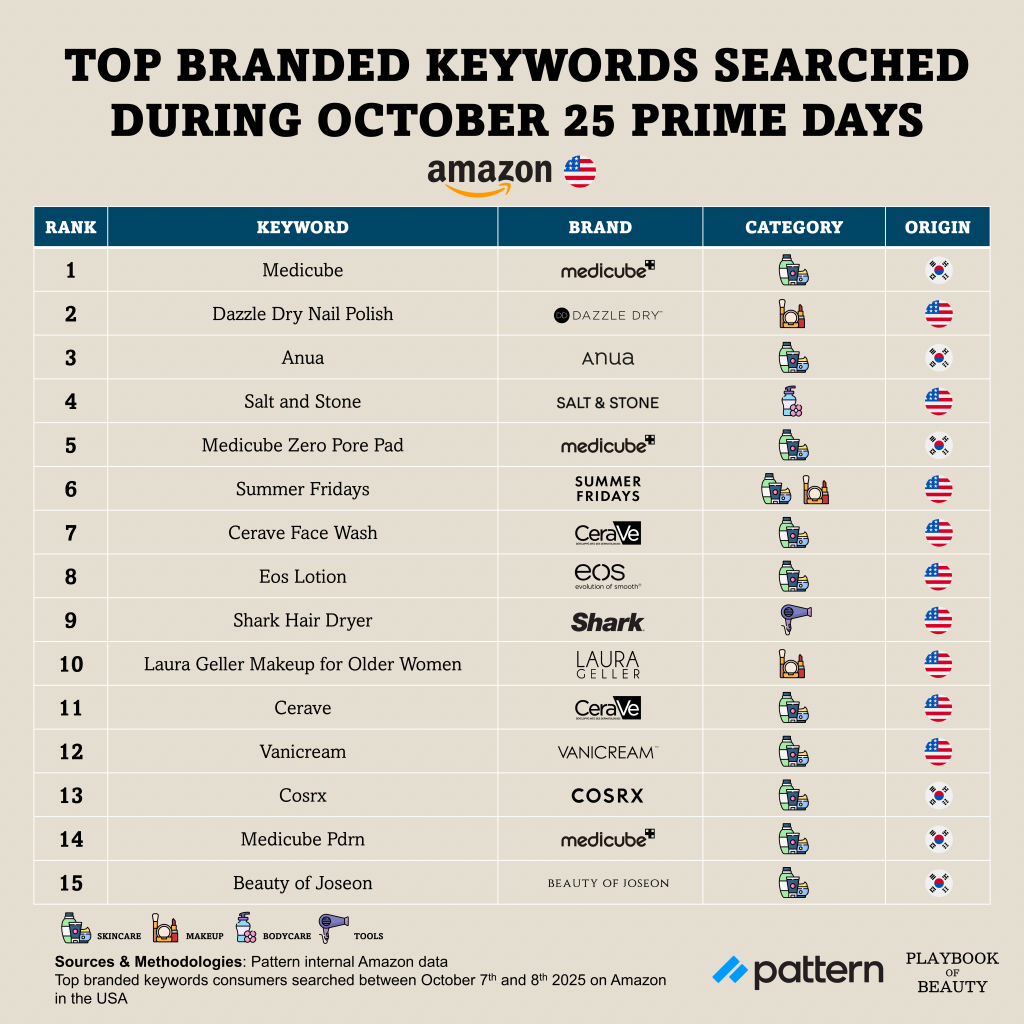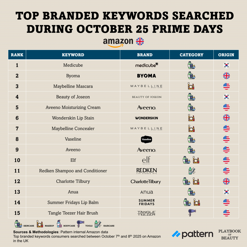 In the US, searches were dominated by American and South Korean brands. Skincare was the clear category leader, accounting for 12 of the top 15 branded searches. Medicube emerged as the most searched brand, placing three keywords in the ranking. CeraVe also showed significant strength with two keywords in the ranking, reinforcing its position as Pattern’s reported global top skincare brand on Amazon for Q3 2025. Makeup represented three searches, while haircare and fragrance were absent.