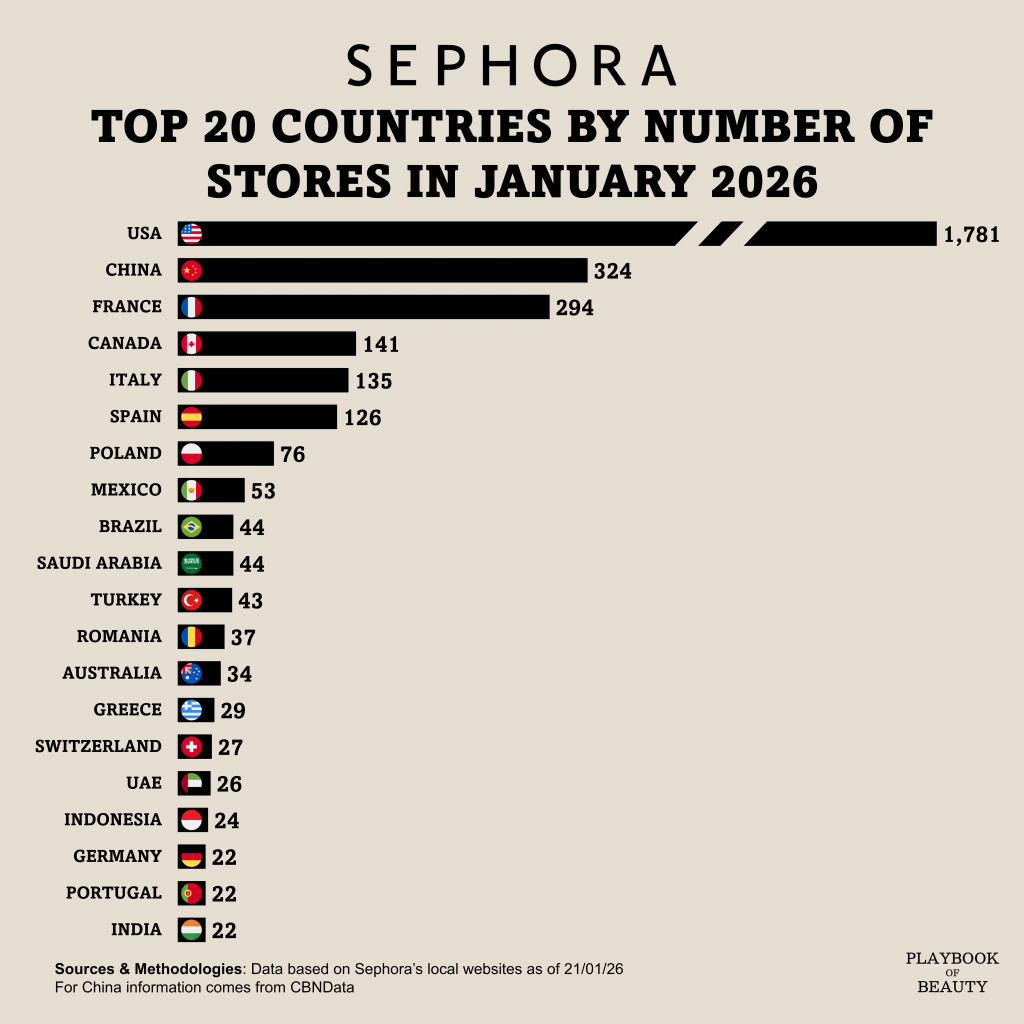 As of January 2026, Sephora remains the world’s dominant selective beauty retailer, operating just under 3,450 stores globally, with its largest footprints in the United States (over 1,780 stores), China (320+), and France (290+). Europe represents around 25% of Sephora stores at around 870 stores.