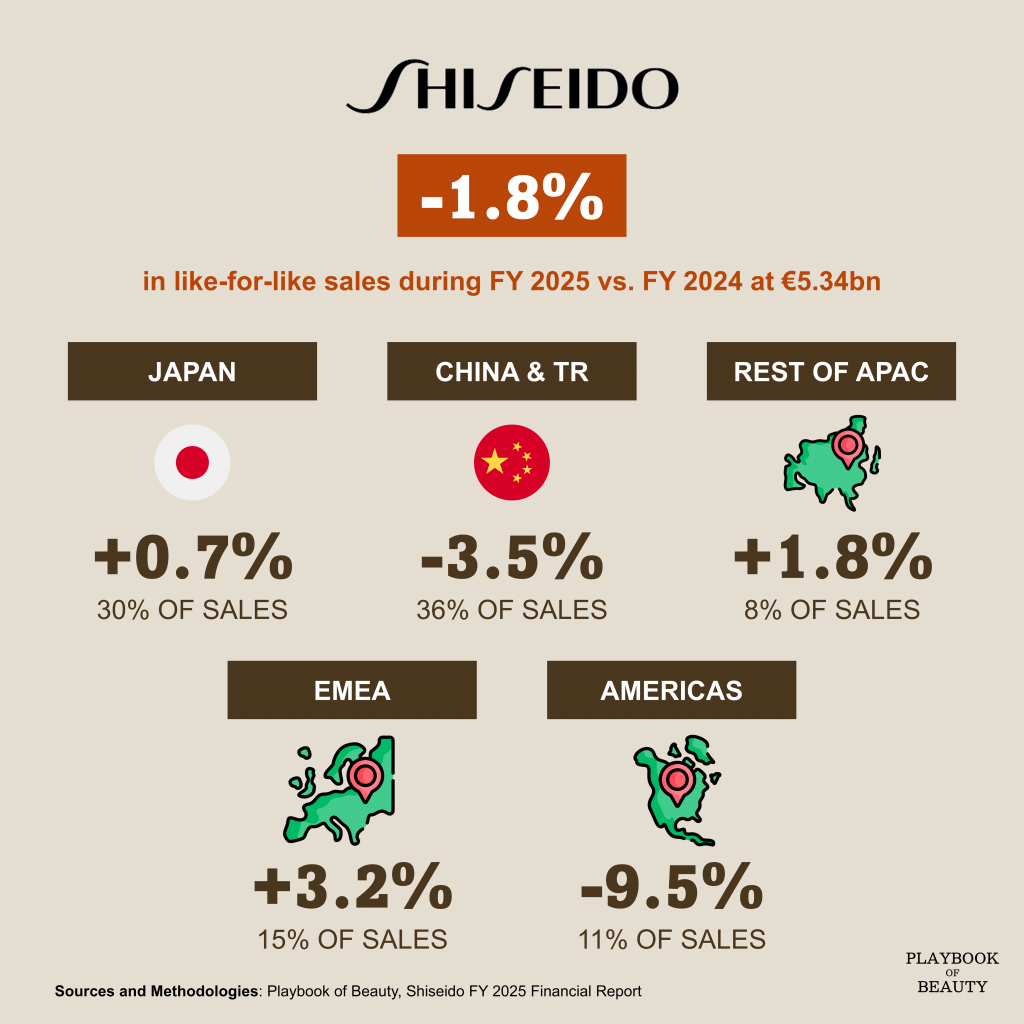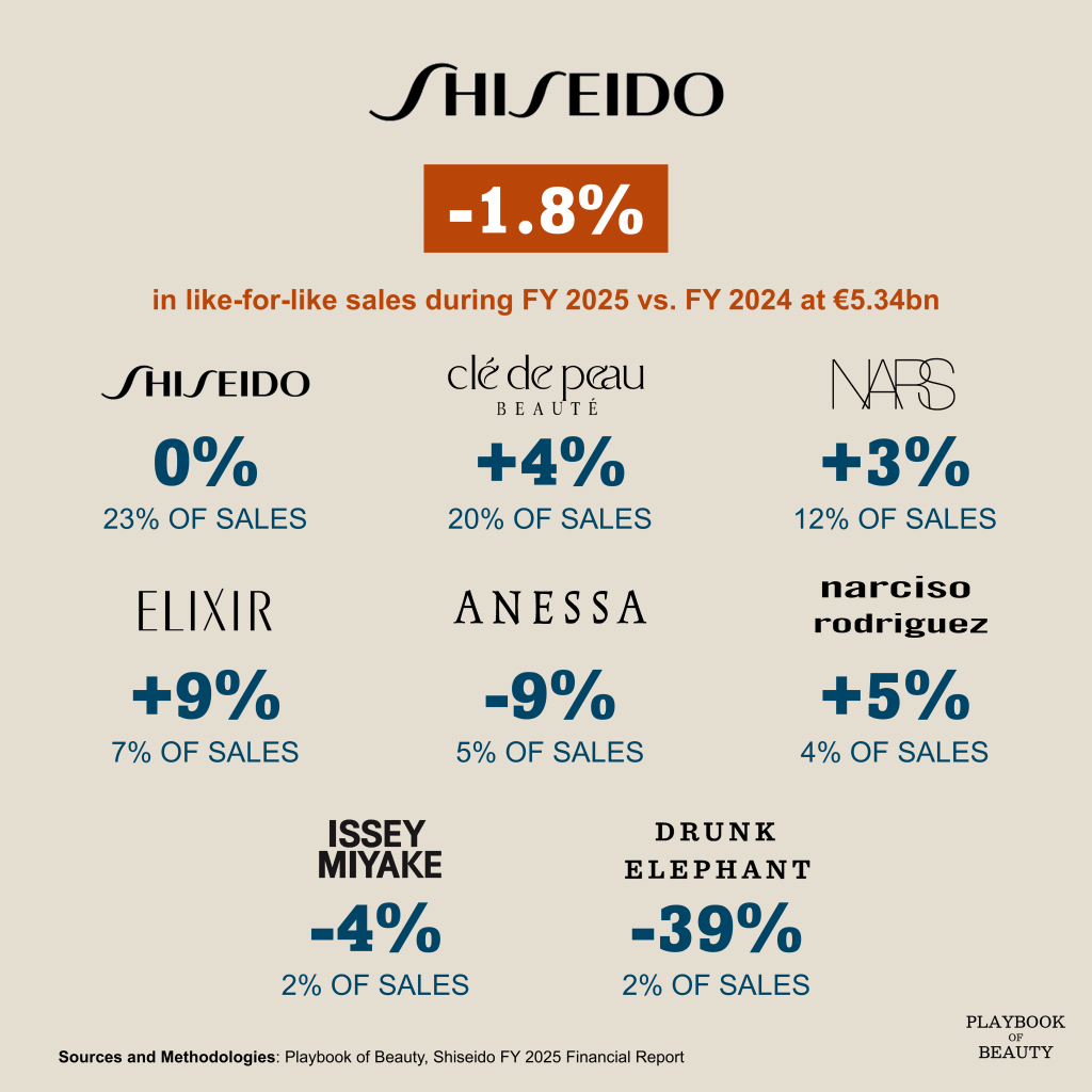 Americas declined 9.5% like-for-like. Drunk Elephant continued to lose ground; NARS faced shipping-timing comparators. SHISEIDO and Clé de Peau Beauté delivered revenue growth but could not offset the broader weakness.
