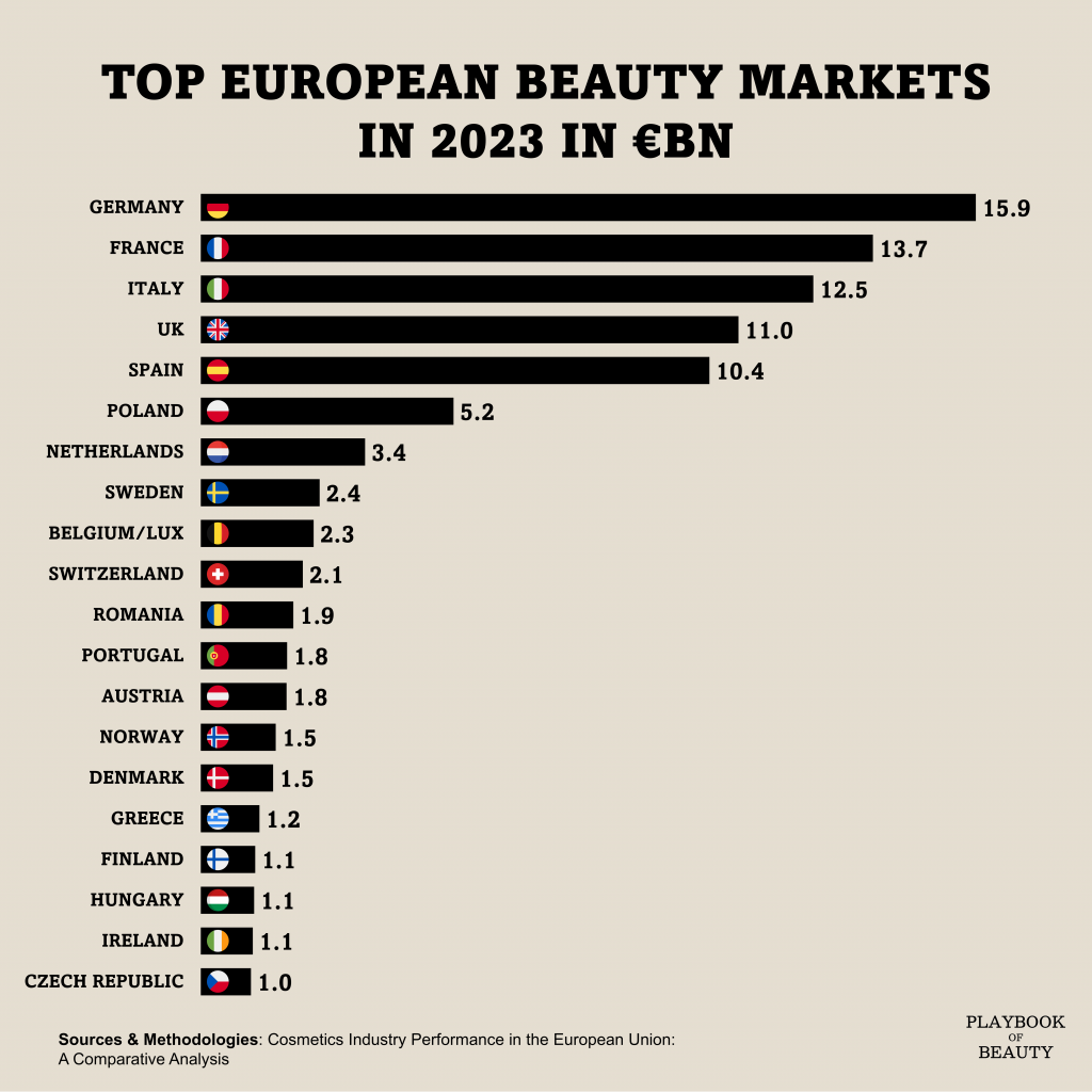 Poland, in sixth position with a €5.2bn market, stands out as the EU’s fastest-growing. With government data suggesting the Polish cosmetic industry experienced a remarkable 16.8% growth rate in 2024.