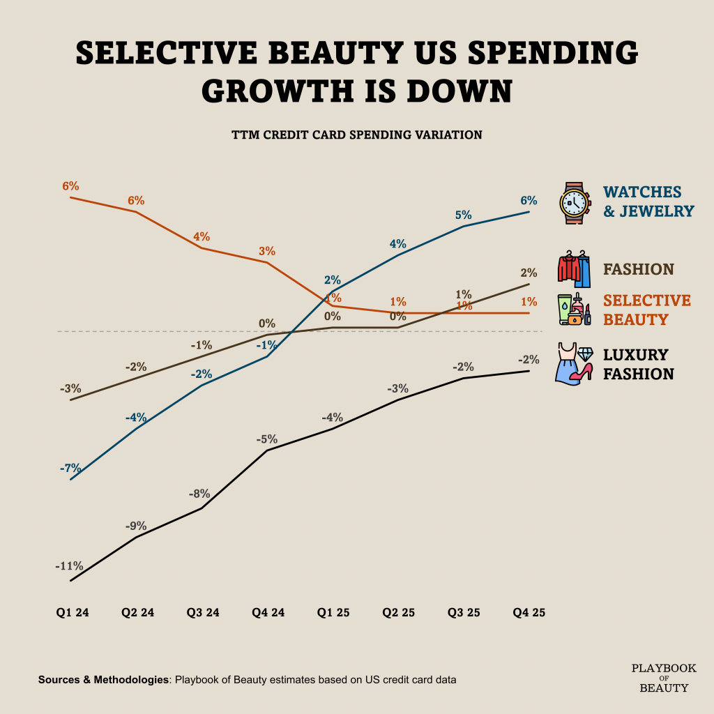 For much of 2024, selective beauty spending in the US was the outlier, its growth outperforming almost every other consumer category. But this growth have been consistently trending with Fashion spending growth overtaking specialty beauty in H2 25 signaling that the sector is entering a new phase.