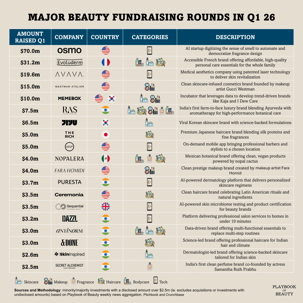 I identified 19 companies in the beauty space that raised at least $2.5m in Q1 2026, totalling just over $180m collectively raised.
