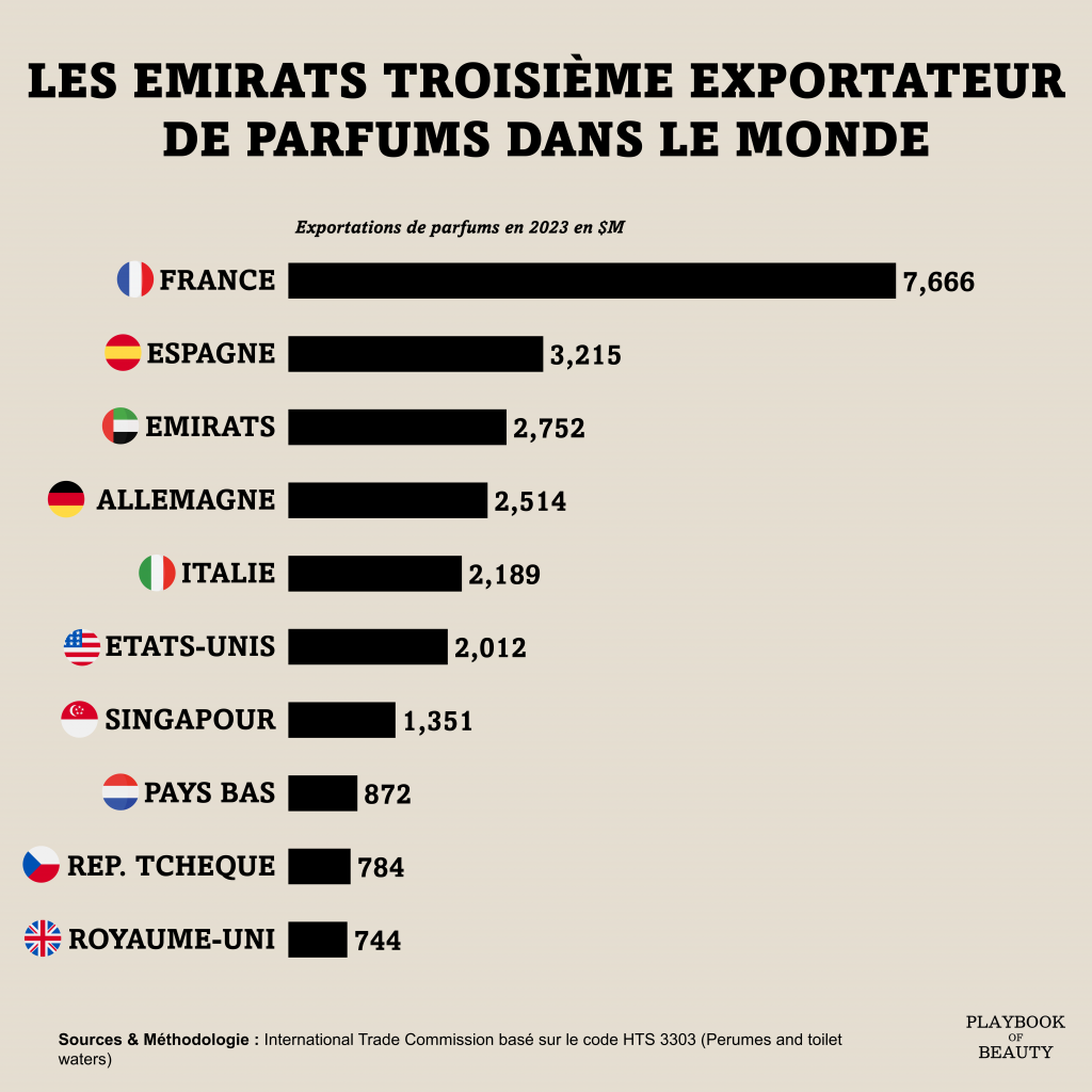 Today, however, the region is also emerging as a major exporter. The United Arab Emirates in particular has risen from 10th to 3rd place globally among perfume exporters, behind France and Spain only, with exports reaching nearly $3bn in 2023.