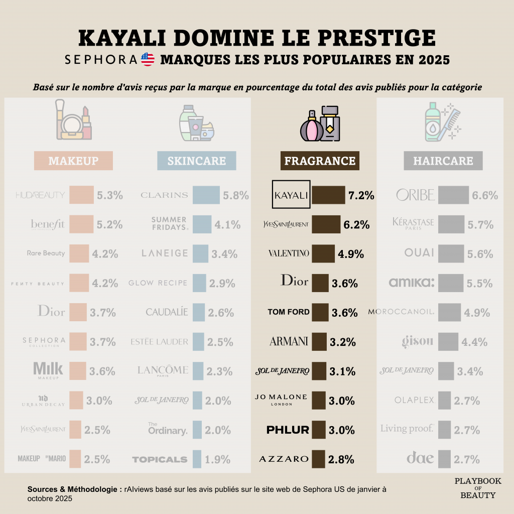Finally, KAYALI dominates the prestige segment: in 2025, it was the most talked-about brand by consumers on Sephora US, according to rAIviews, a leader in beauty product review analytics.