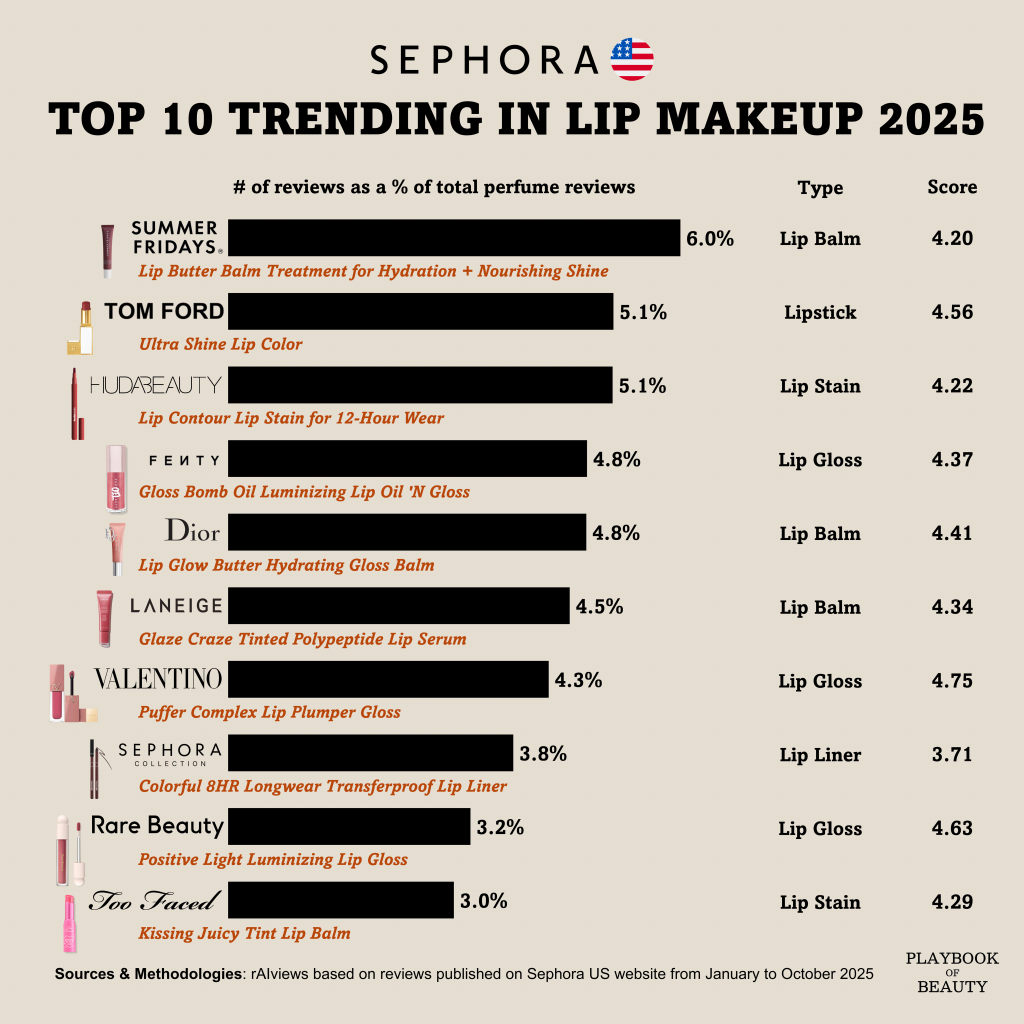 Data from rAIviews, the leading customer reviews analytic software, on the most reviewed lip SKUs at Sephora US for 2025 reveals key insights on the evolution of the category.