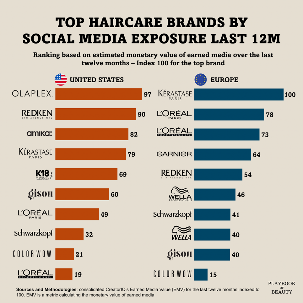 In Europe, established professional and mass brands have an edge. Kérastase achieves the overall top score, followed by L’Oréal Paris at 78 and L’Oréal Professionel at 73, while the American frontrunner Olaplex fails to reach the top ten entirely overseas.