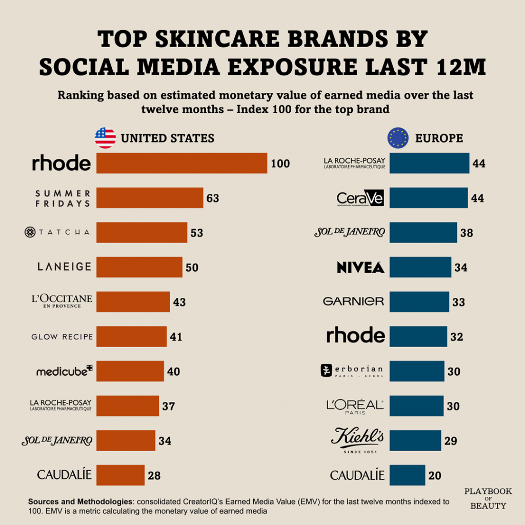In Europe, clinical heritage and accessible pharmacy brands lead a highly fragmented landscape. La Roche-Posay and CeraVe tie for the regional lead at 44, while the US champion Rhode experiences a steep transatlantic drop, with an index of just 32 overseas.