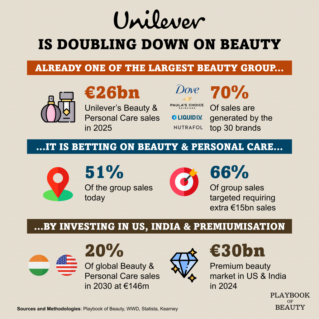 Beauty & Wellbeing contributed €12.8bn in 2025, while Personal Care accounted for €13.2bn. Achieving the target would require an additional €15bn in sales from the existing portfolio. To reach that scale, the company has prioritised investment in the US and India, alongside a push into premium brands such as K18 and Hourglass.