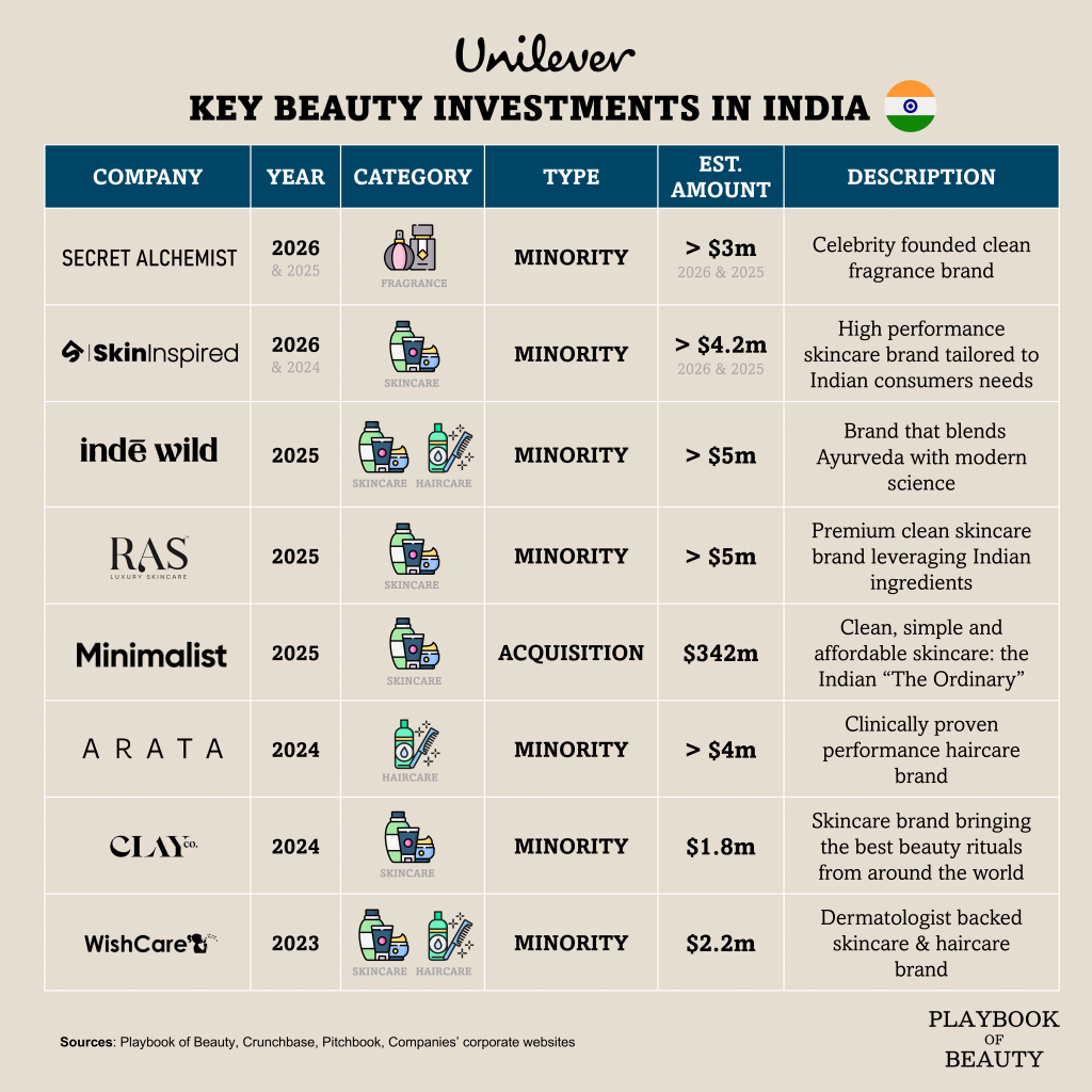 In India, Unilever has been targeting scalable, premium brands with scientific credentials or clean formulations. According to Crunchbase, Unilever has invested or acquired eight Indian companies since 2023, with an emphasis on skincare and haircare. The most notable investment was the acquisition of Minimalist in 2025, a clean skincare brand often compared to The Ordinary, for $342 million.